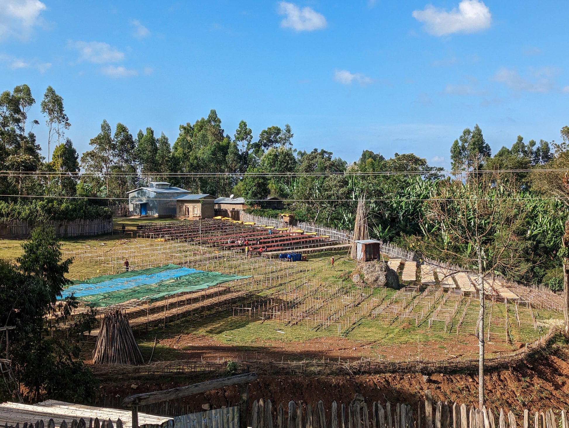 “We stopped by Basha’s Bombe drying station on our second day in Bensa in December. Basha’s father—also a community man who with Basha built a church for the community at their site in Bombe—was once a manager for a co-op in Bombe that supplied coffee to the Sidama Union. Before the government made it possible for smallholders to obtain export licenses, both he and his father sold their cherry to the cooperative. Basha now has his own export license and grows coffee (primarily 74158, known locally as “Walega”) in semi-forested plots on 12 hectares in addition to operating collection sites in Bombe, Shantawane, and Kokose—collecting cherry from producers growing coffee as high as 2300 masl. While cherry prices were high this year, Basha maintained a practice we didn’t see everywhere: delivering a second payment to the 126 producers he bought cherry from once the coffee sold. Like most smallholders around Bensa, Basha exclusively produces dry processes—which includes experiments with anaerobic styles of fermentation—and practices cherry flotation before drying his coffee slowly on raised beds (with some preparations drying under shade). This is our first import from Basha.”